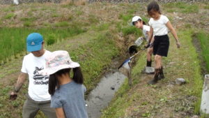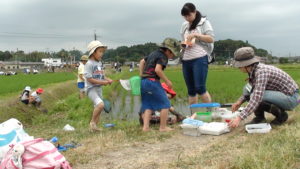 今回は無農薬、無化学肥料で行う米作りで一番大変な作業となる草取りを体験し、そして、生き物調査をして田んぼと共生する生き物の名前や生態を学びました。