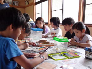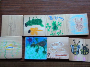 昼食でおいしいごはんを食べて栄養補給をした後は木のコースターに生き物のお絵かきをしました。子どもたちの観察力と表現力は本当に素晴らしく、とっても素敵な作品に感激しました。