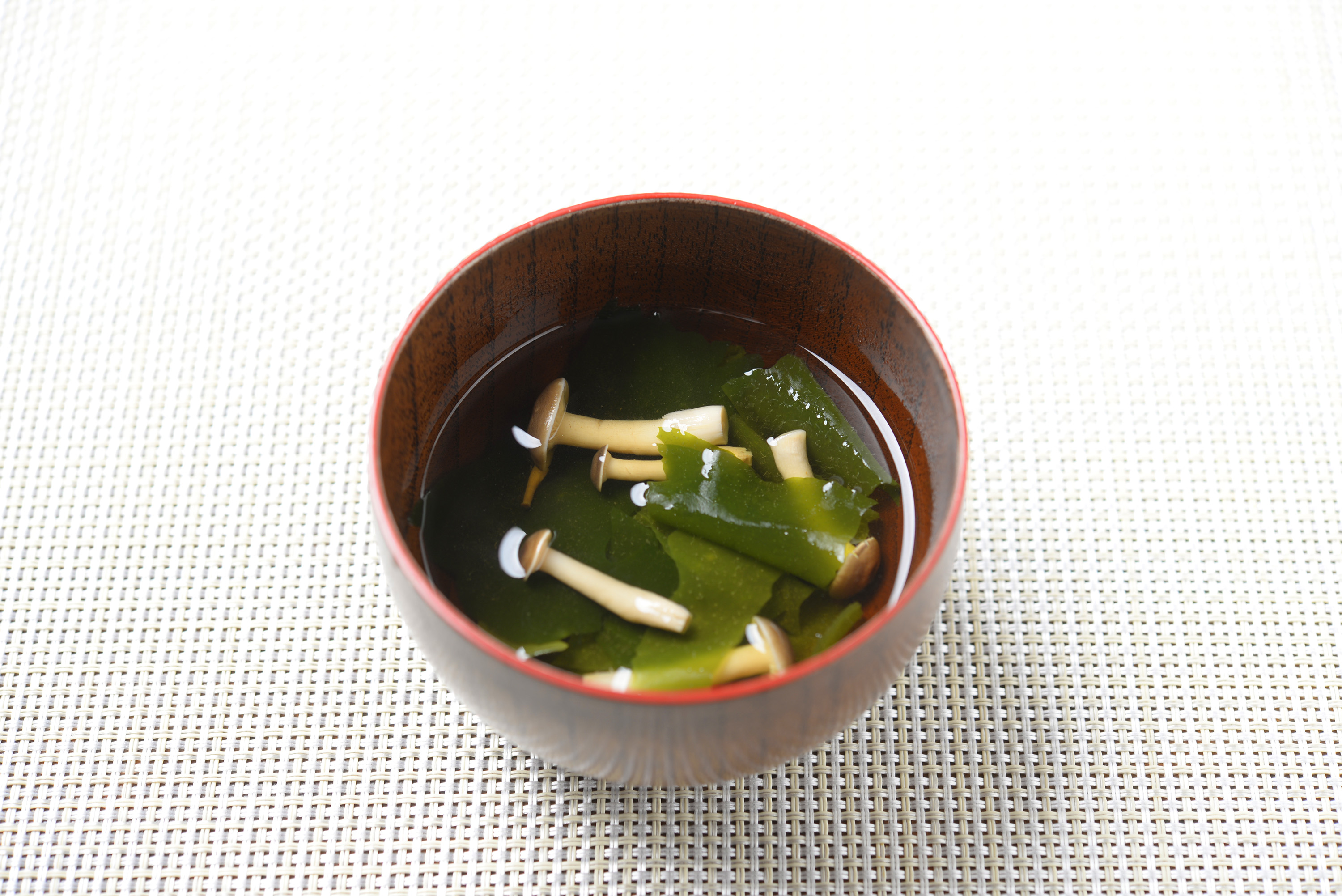 だし汁を鍋に入れて、煮立ったら塩としょうゆを入れる。しめじを入れてひと煮立ちさせたら、わかめを加えて、火を止める。