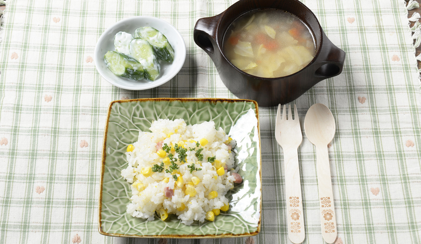 とうもろこしの甘さが味わえて、生のとうもろこしが手に入る時期にはせひおすすめです。ベーコンをだし代わりに使用しています。